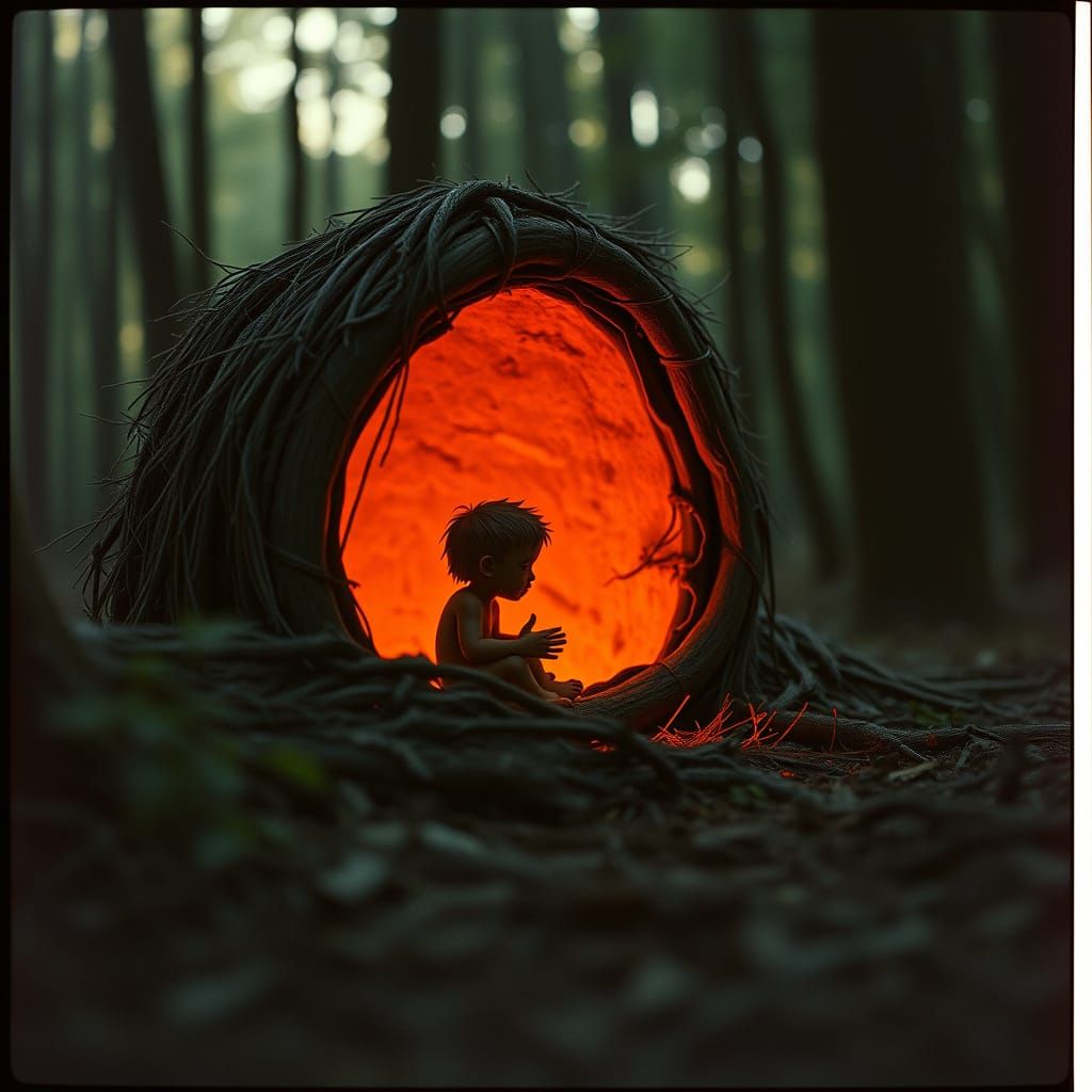 A hyperrealistic image of tiny forest inhabitants. The picture features cinematic lighting and film grain, creating an atmospheric and dramatic scene reminiscent of a film still.