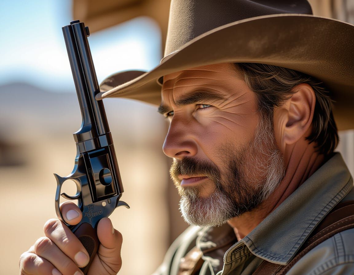 Extreme close-up of a cowboyโs head in profile, holding a Colt revolver upright to lift the brim of his hat. The setting is a dusty Western village in the desert.