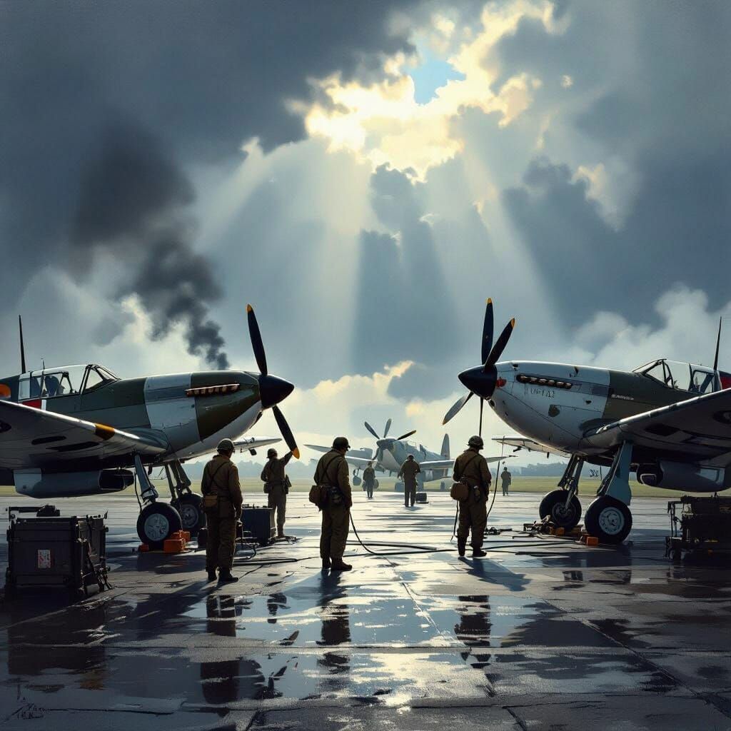 This image depicts a busy World War Two airfield with Spitfire and Mustang planes being serviced. Mechanics in vintage uniforms work diligently beneath a dramatic, overcast sky with sunbeams, rendered with gritty detail and a desaturated palette.