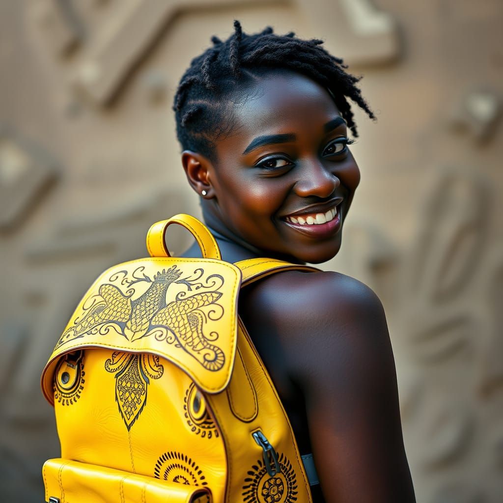This image captures a dark-skinned woman with a bright smile, wearing a vibrant yellow leather backpack adorned with intricate carvings inspired by Gabon's rich cultural heritage, rendered in a lifelike, photo-realistic style