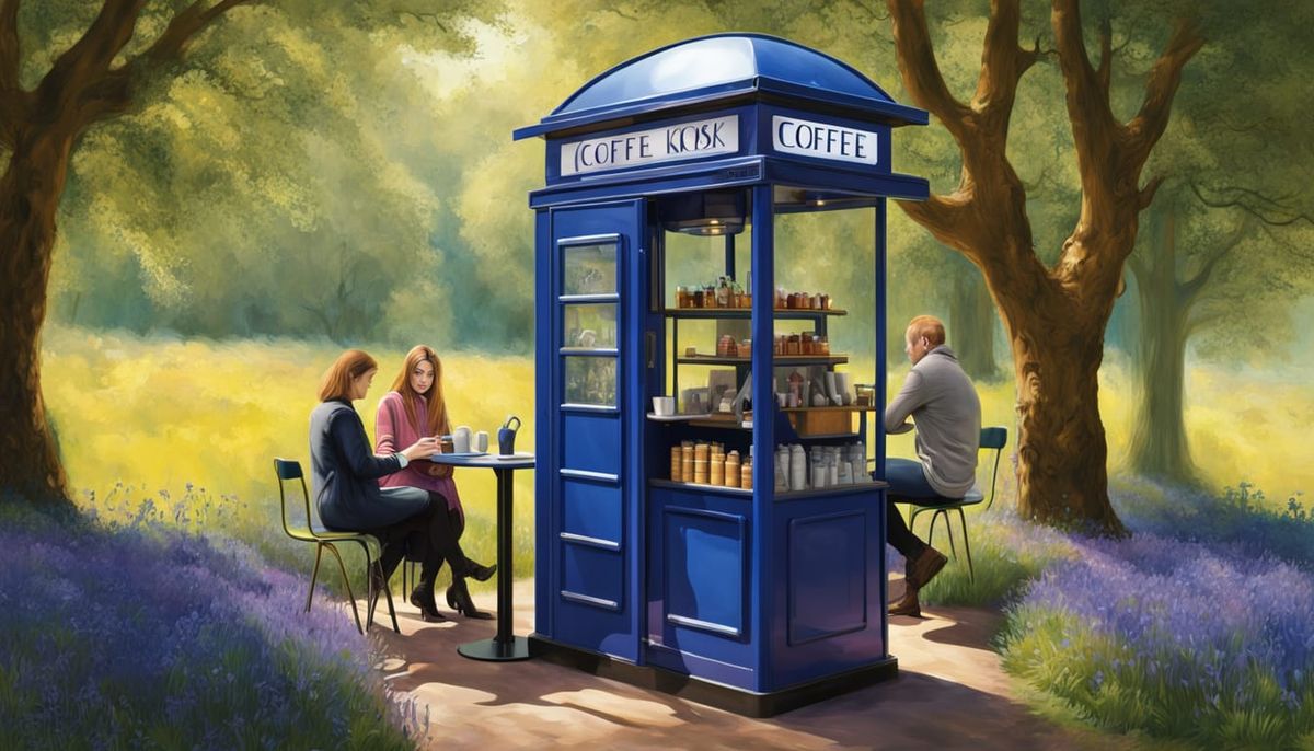 This hyper-realistic image depicts a fantasy coffee and tea kiosk nestled within a vibrant bluebell meadow, with people enjoying refreshments at tables.