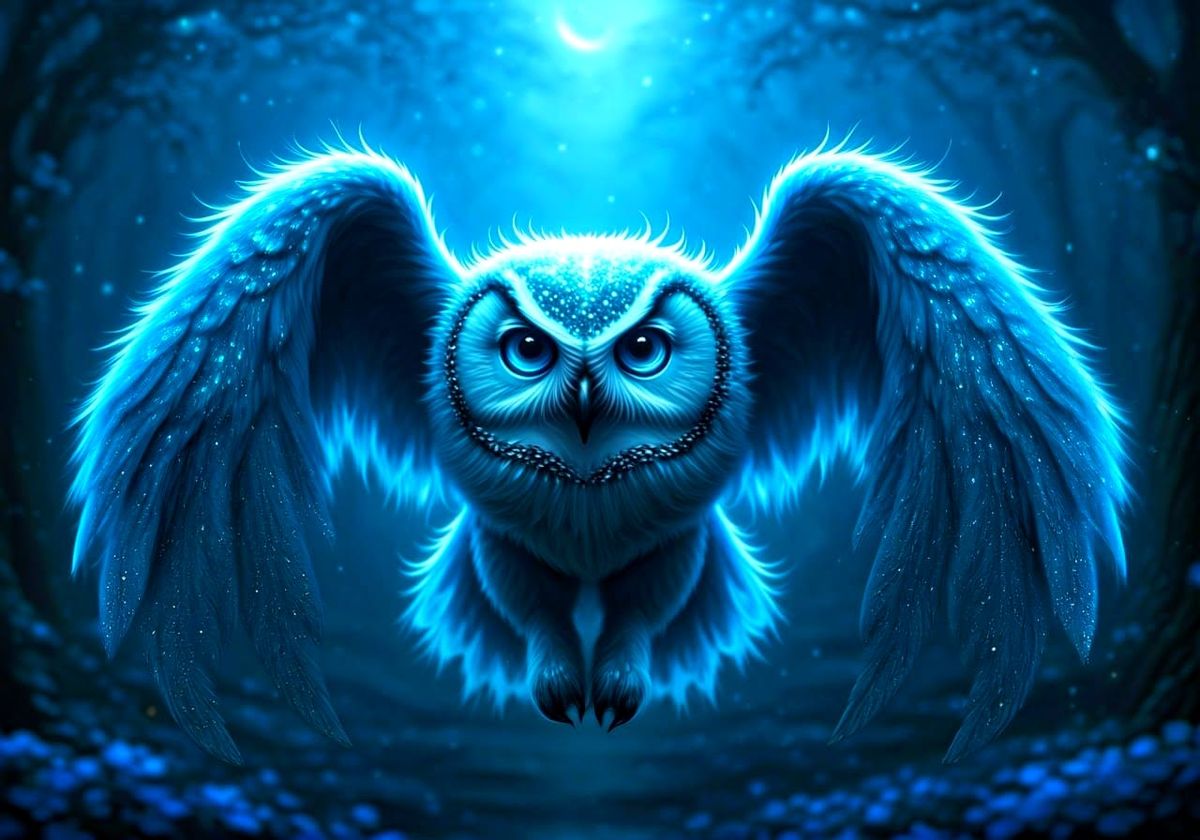 A striking picture of a majestic, fluffy owl in flight. The owl glows with blue glitter, its dense fur finely detailed. It flies through a forest illuminated by a blue moon and blossoms.