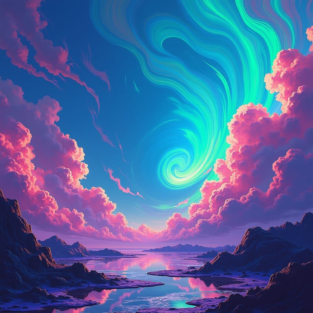 A mesmerizing display of swirling clouds in vibrant blue, electric lime green, pink, and purple. This digital artwork features bold, neon brushstrokes and intricate, glowing details in a cyberpunk aesthetic.