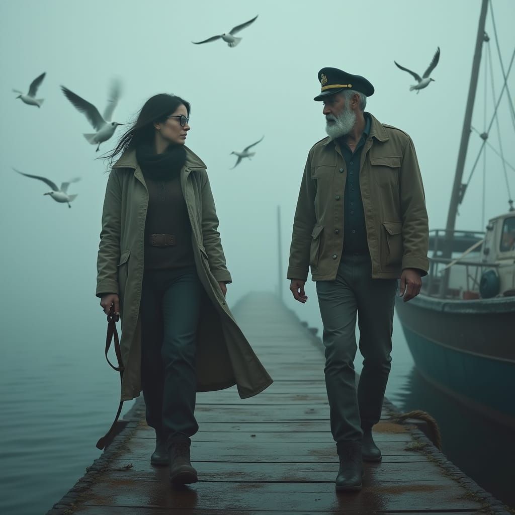 A realistic image of Dr. Layla Hanif disembarking a research vessel onto a misty dock. The eerie coastal scene features muted colors, ominous lighting and textures reminiscent of Beksiński's art.