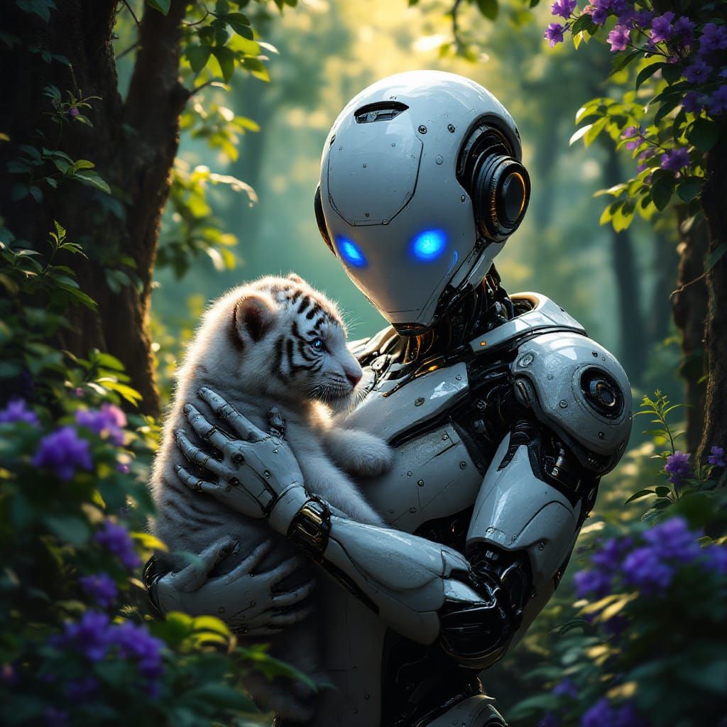 A highly detailed matte painting of a robot with glowing blue eyes holding a baby white tiger in a misty forest. Lush foliage and warm light create a fantasy atmosphere.