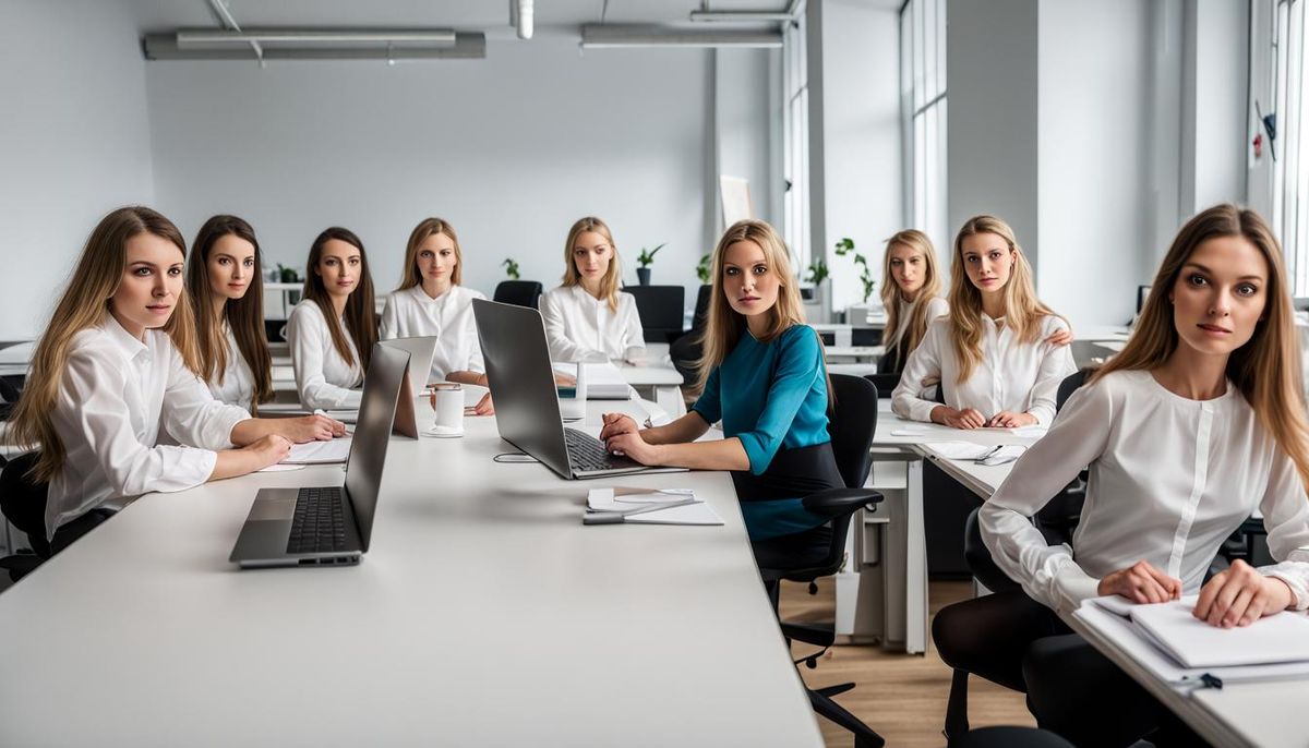 This image shows a woman at an office desk. The artwork features a detailed matte painting with deep colors and intricate details, reminiscent of fantasy concept art in 8k resolution.