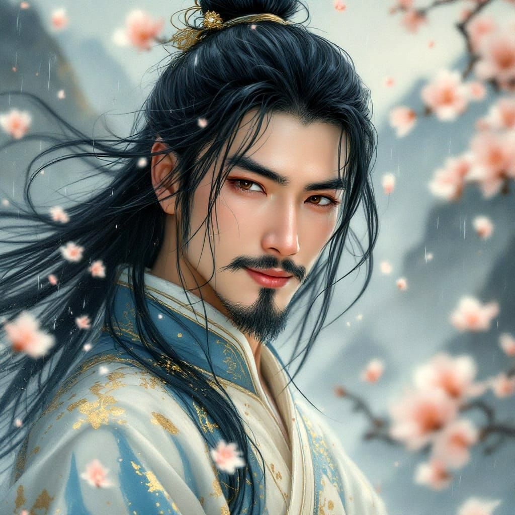 This image shows a handsome, beardless Asian man in traditional Chinese fantasy attire, surrounded by falling cherry blossoms and heavy rain, set against a misty mountain backdrop, rendered in a watercolour style with intricate detail.