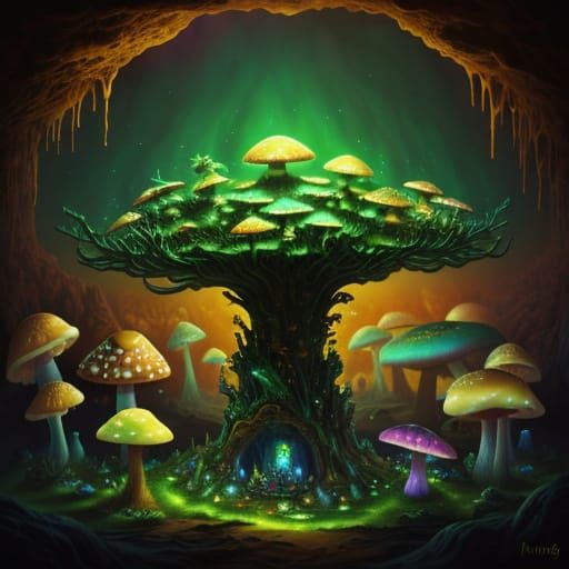 A surreal close-up of an alien figure in an underground cave holding marijuana. The image features glowing mushrooms, ethereal mist, and warm lighting, rendered as hyperdetailed 3D animation.