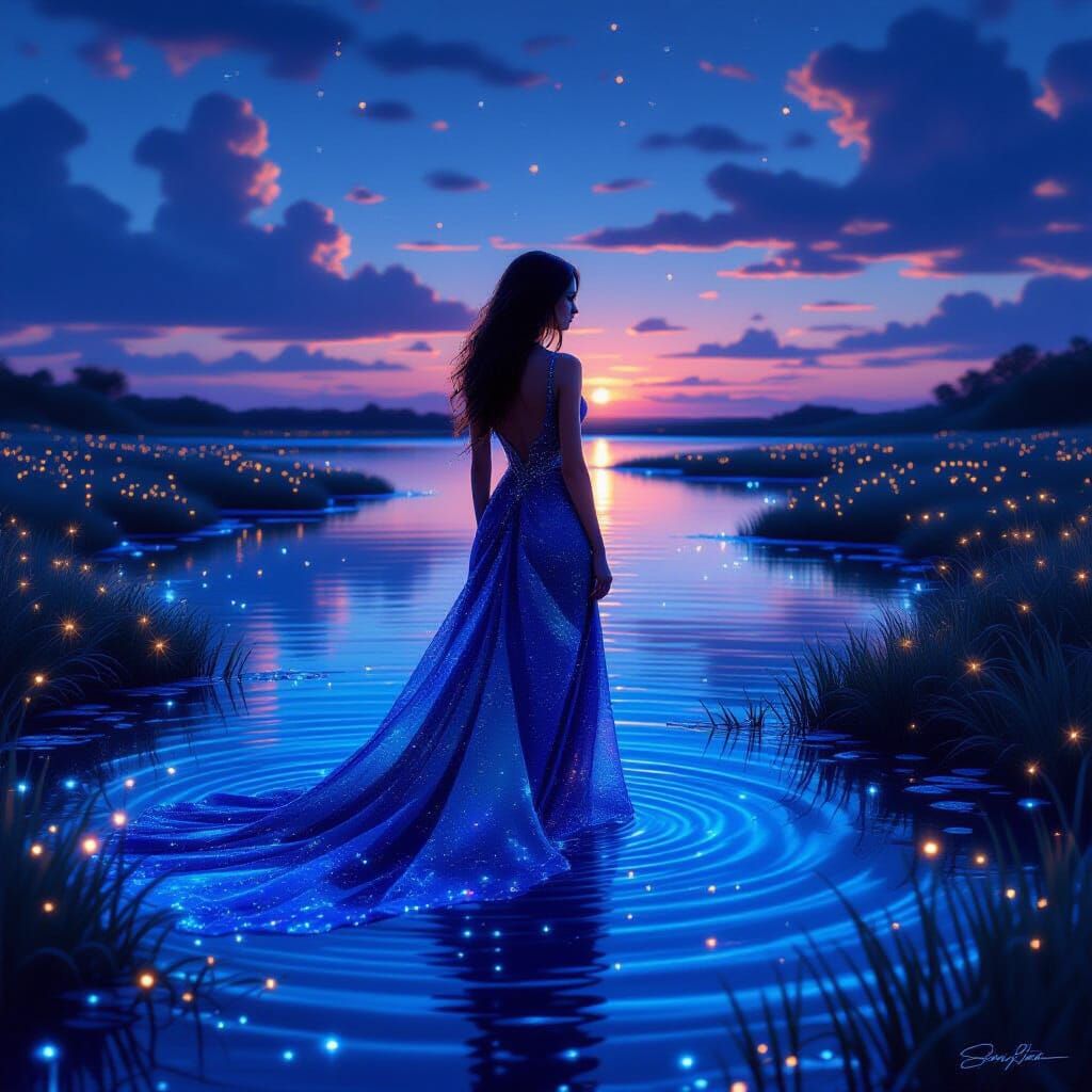 A woman in a shimmering, iridescent dress stands in a mystical lagoon under a twilight sky. Bioluminescent plants glow around her, creating an ethereal and wondrous scene with rich colors.