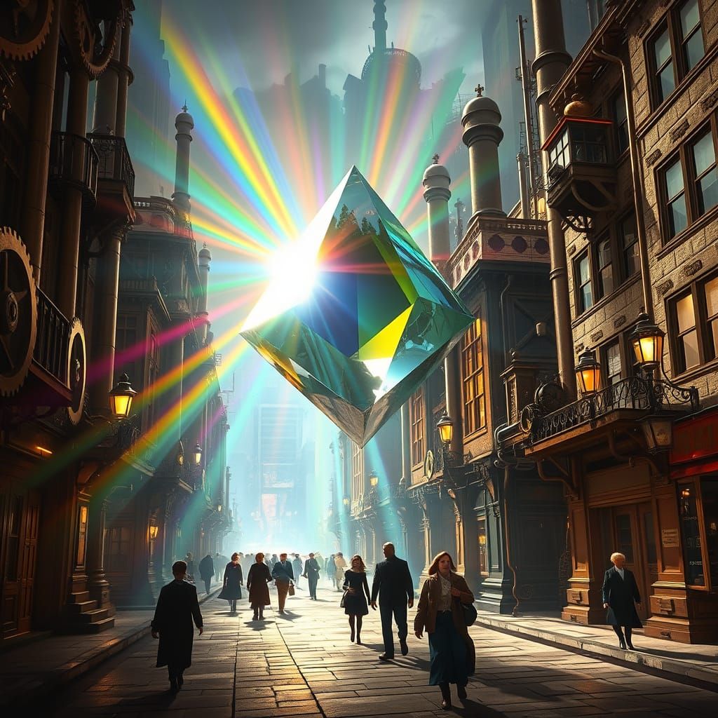 A massive prism floats in the center of a steampunk city, refracting sunlight into a dazzling array of colors that illuminate the surrounding architecture. Brass gears and steam pipes wind through streets paved with old stone, reflecting the rainbow hues. Citizens in Victorian attire walk past mechanical ...