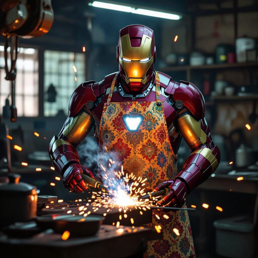 A photorealistic image of Iron Man in a welding shop, wearing his suit and a colorful patterned apron. Sparks fly as he faces the camera in a realistic style.