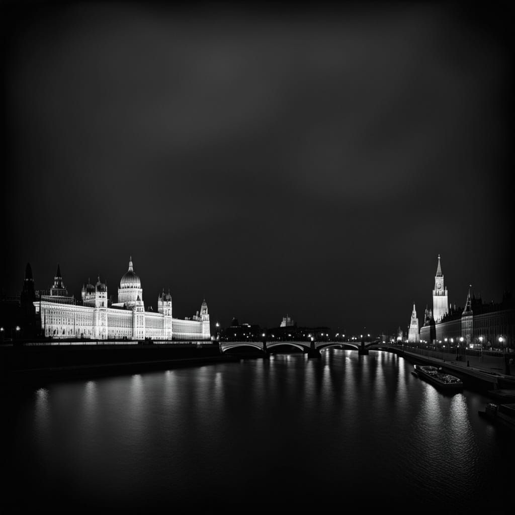 This image is a film noir-inspired, photorealistic cityscape with a soft focus, vapor-like atmosphere, and a sense of ominous foreboding, created using subtractive lighting and a telephoto lens effect.