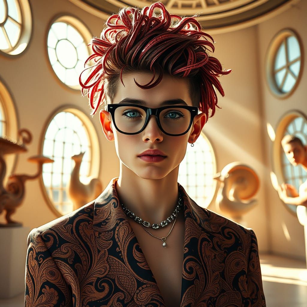 A photorealistic image of a stylish teenage boy in a patterned outfit in an art gallery. The artwork features surreal sculptures, morphing grids and unusual botanical elements in a vintage style.
