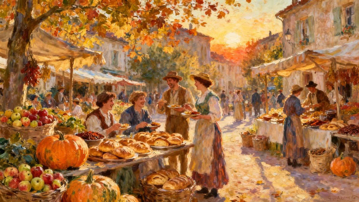This image captures a vibrant harvest festival in a village square, showcasing overflowing stalls of produce and happy villagers. Rendered in a luminous Impressionist style with loose brushstrokes, it highlights the golden hour's warm glow and joyful atmosphere.