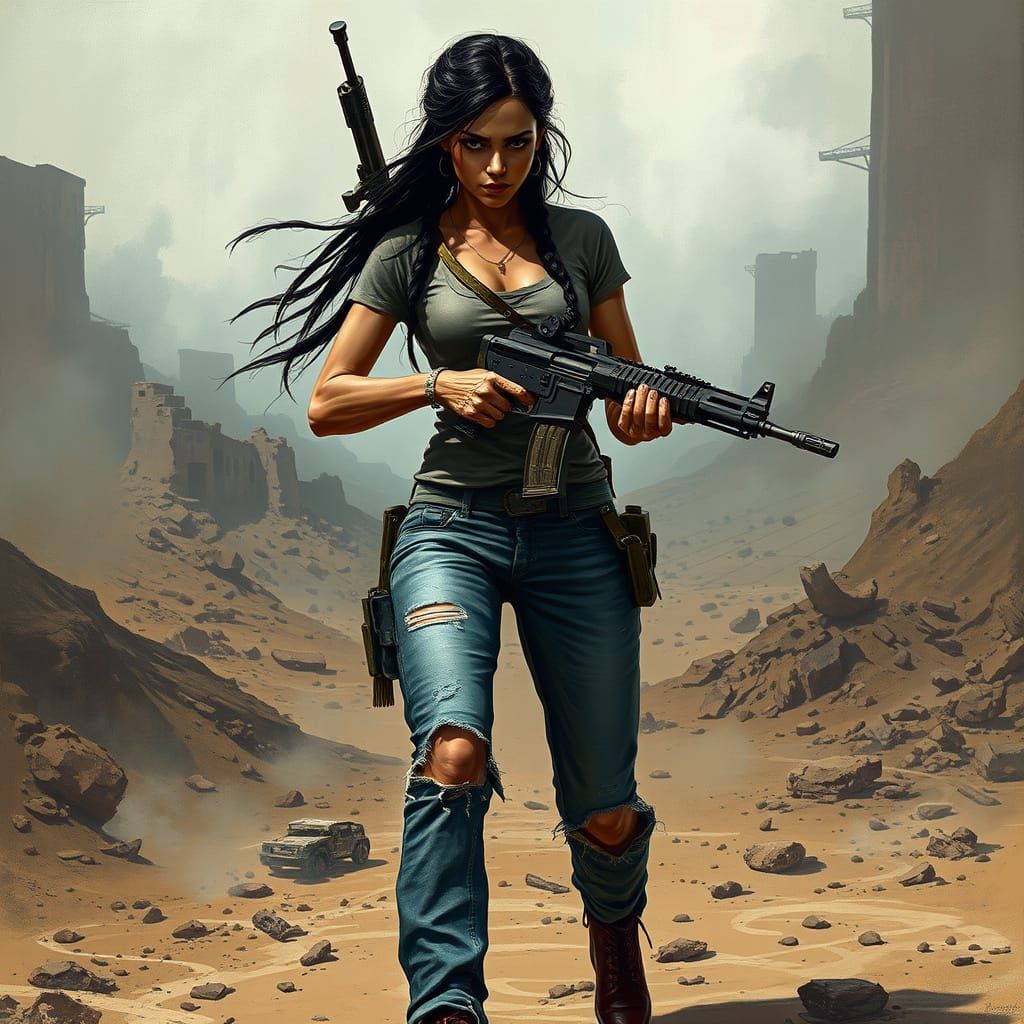 A determined cyborg woman with a mechanical eye and arm advances through a devastated landscape, armed and ready. Blends gritty realism with dark fantasy elements.