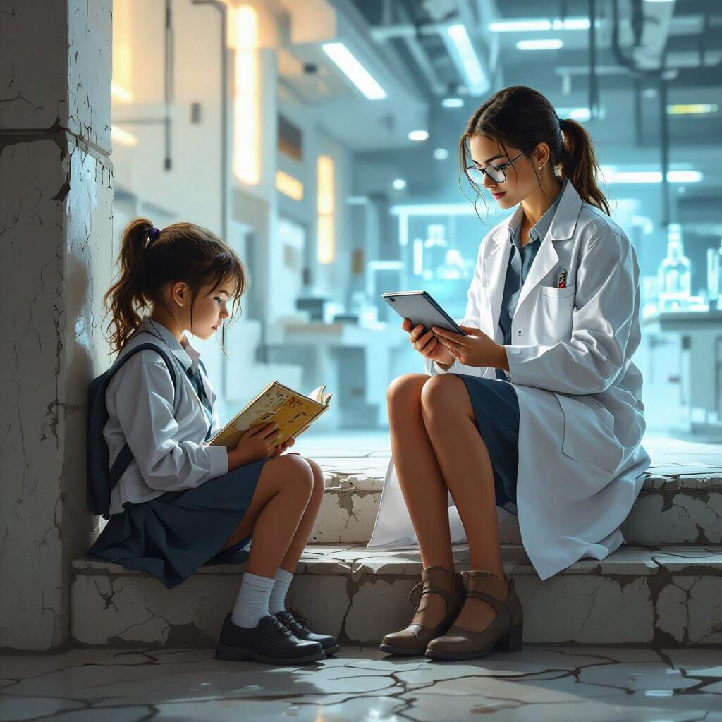 This image shows a split portrait of a girl transitioning from a student to a scientist. The artwork blends warm and cool tones, reminiscent of futuristic digital paintings.