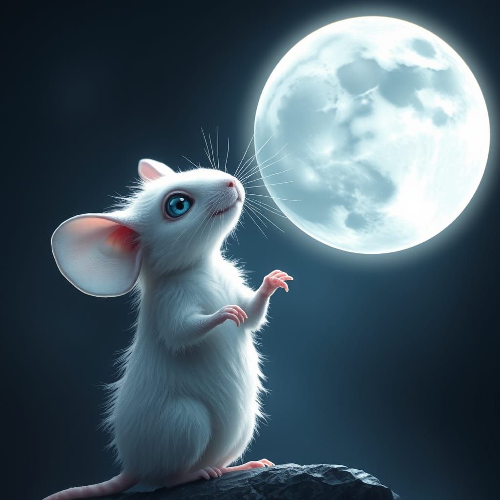 This enchanting image depicts a majestic white mouse standing on its hind legs, gazing up at a full moon with deep, expressive blue eyes. Soft, glowing light illuminates the intricate details of its fur and whiskers in a fantasy concept art style.