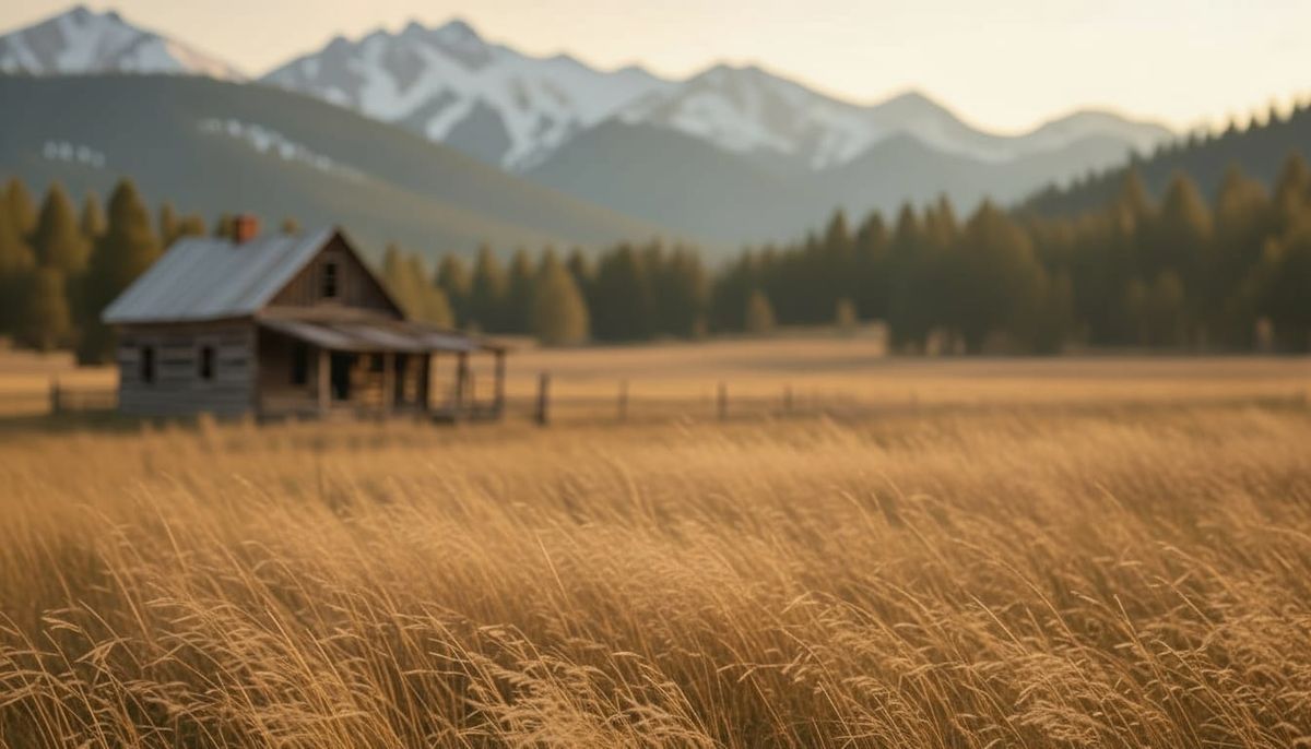A photorealistic cinematic scene featuring a red-haired woman and a rugged man near a homestead, with golden sunlight on hills and mountains. Designed for text overlay.