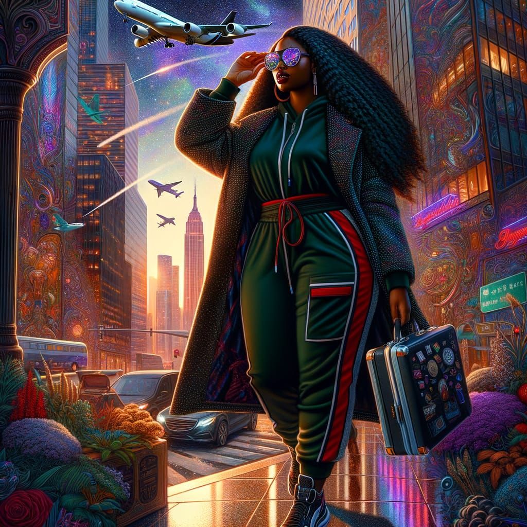 This image shows a stylish African American woman leaving a hotel with luggage, ready for travel. The artwork uses vibrant colors and intricate details, resembling concept art with fantasy elements.
