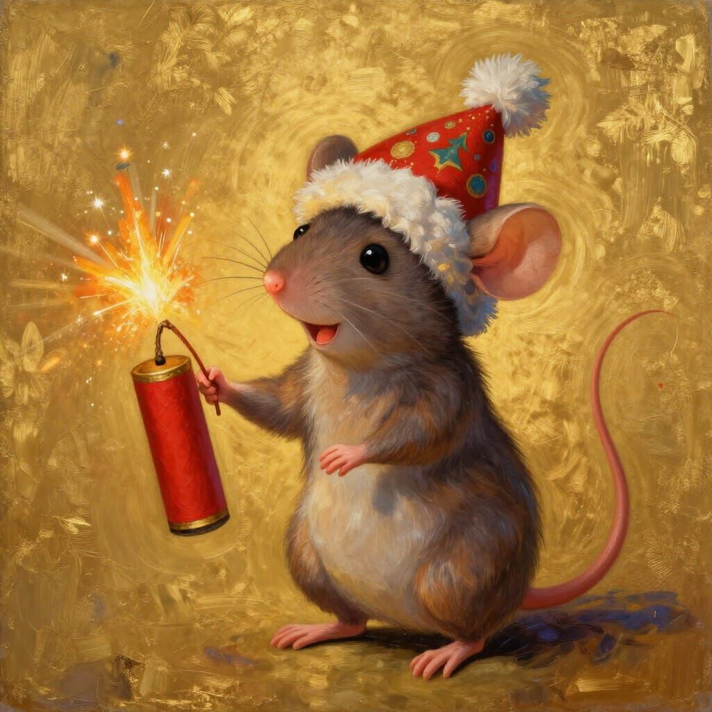 This image showcases a joyful mouse with a festive hat and firecracker, created with tempera and gold leaf. It blends elongated features with a warm, spiritual ambiance and cinematic lighting.