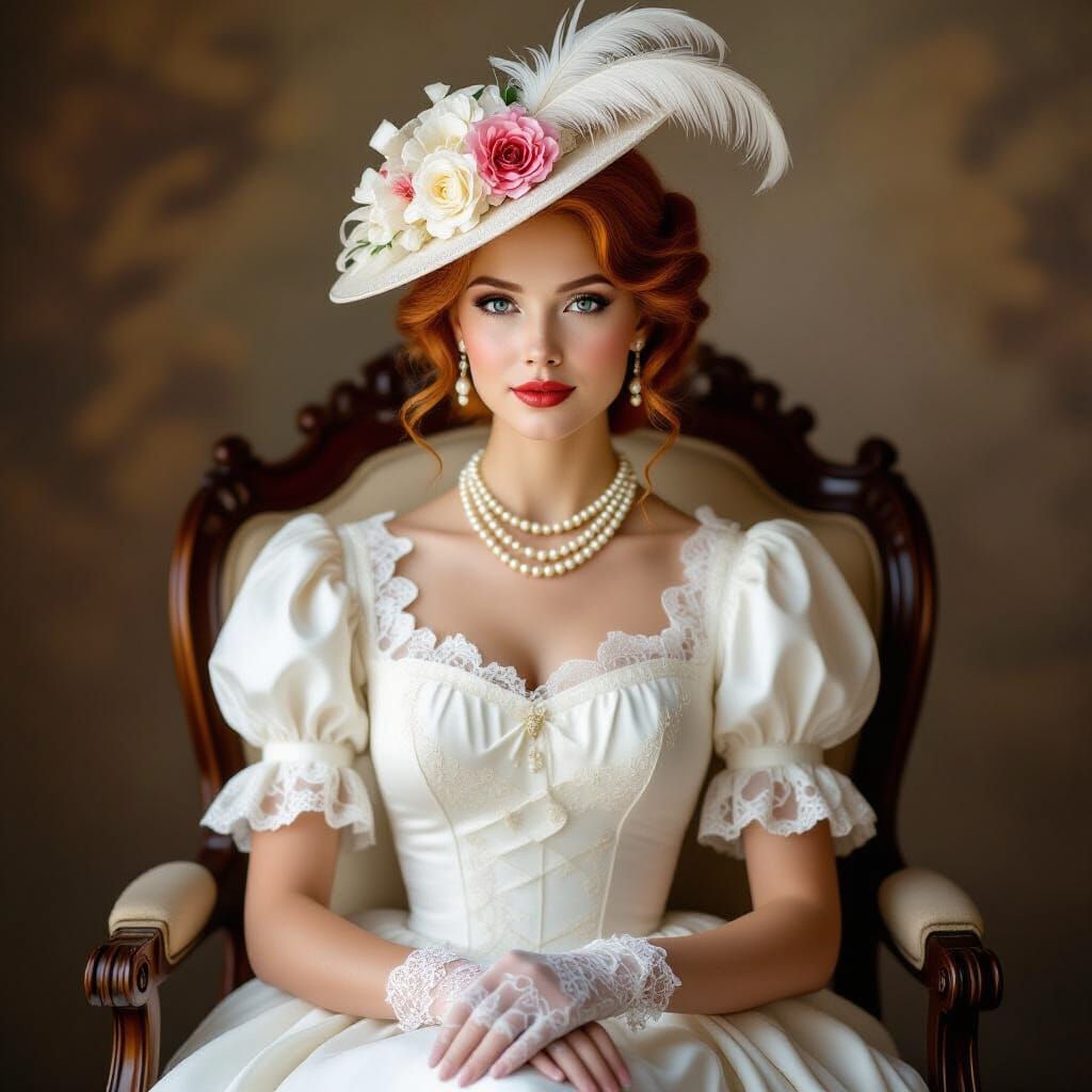 A studio portrait of a woman with Slavic features and red hair, dressed in vintage attire with a hat and fan. Cinematic lighting and a sepia palette evoke imperial St. Petersburg.
