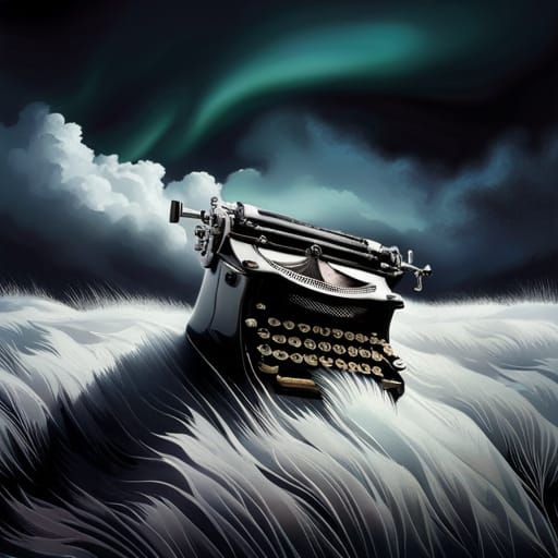 ghostly Victorian-era typewriter barreling through an ethereal landscape under a foreboding, stormy sky, haunting, by Keith Thompson. sinister by Greg Rutkowski