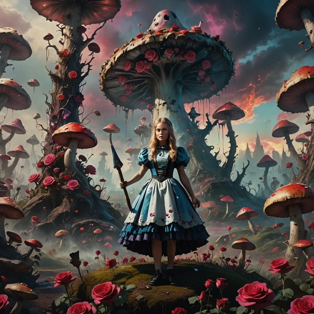 A dark fantasy image of Alice in Wonderland holding an axe, standing on a mushroom. This vibrant oil painting features bold colors and ethereal lighting in a hyper-realistic fantasy setting.