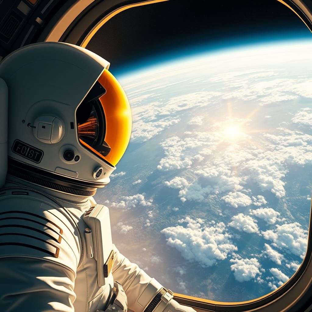 This stunning image shows a spacesuited astronaut gazing out at a beautiful, sunlit Earth, with vibrant oceans, clouds, and forests, evoking the works of Syd Mead and Simon Stalenhag with a hint of atmospheric haze.