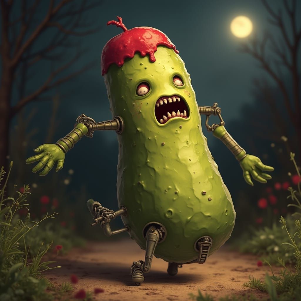 This image shows a terrifying zombie figure with a bright red toupee and robot legs, running through a serene garden under the light of the full moon, in a cyberpunk aesthetic.