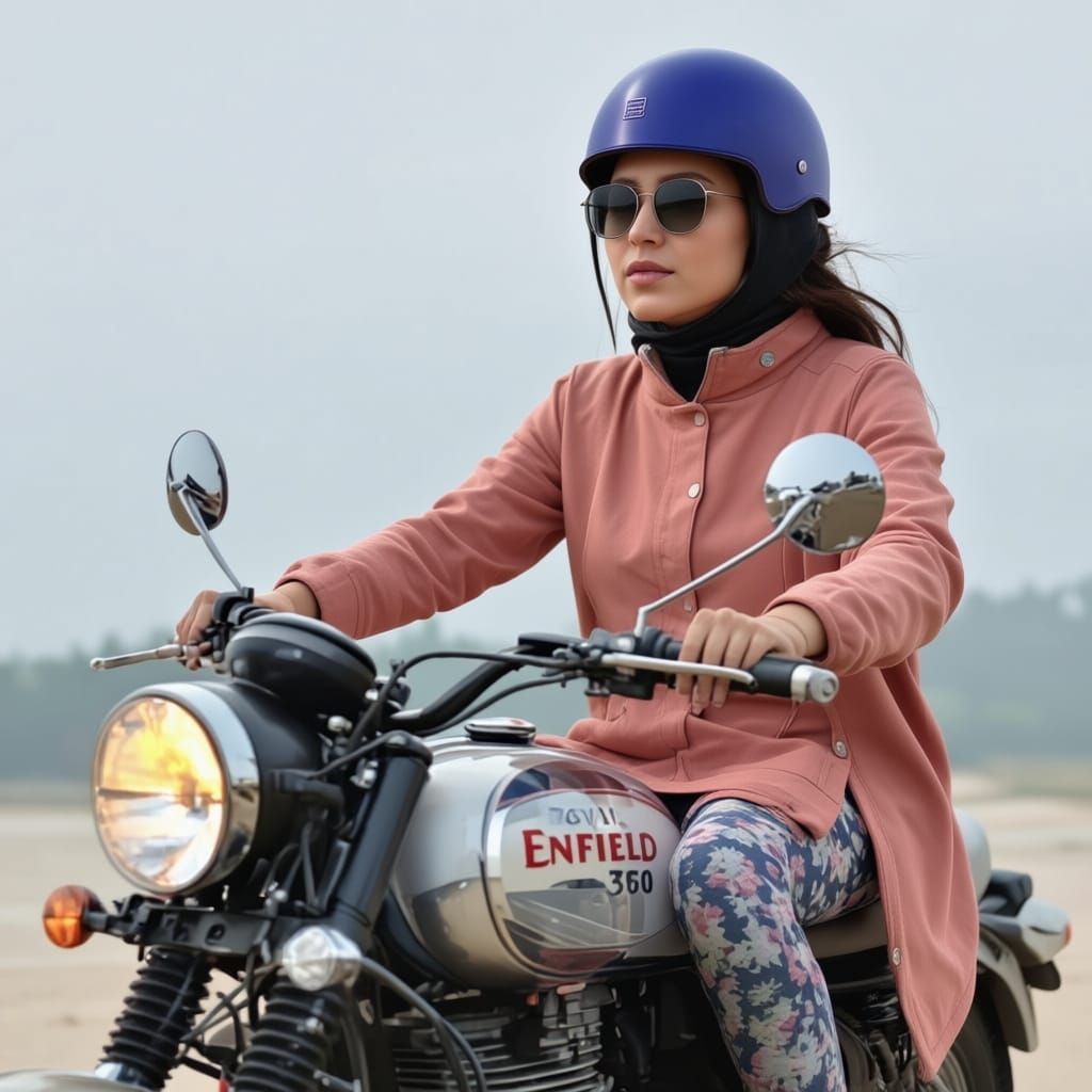 This image captures a 25-year-old woman confidently riding a Royal Enfield Hunter 350 motorcycle, showcasing freedom and adventure on two wheels.