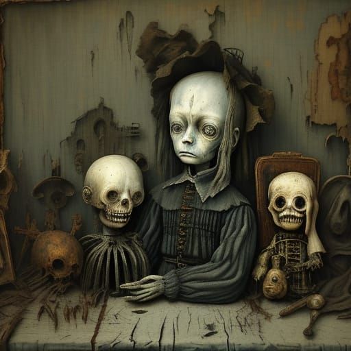 This haunting image captures a porcelain doll with cracked paint and a tattered lace dress, set against a warm, dimly lit background. The doll's unsettling presence is heightened by its lack of eyes, creating a sense of unease and vintage horror.