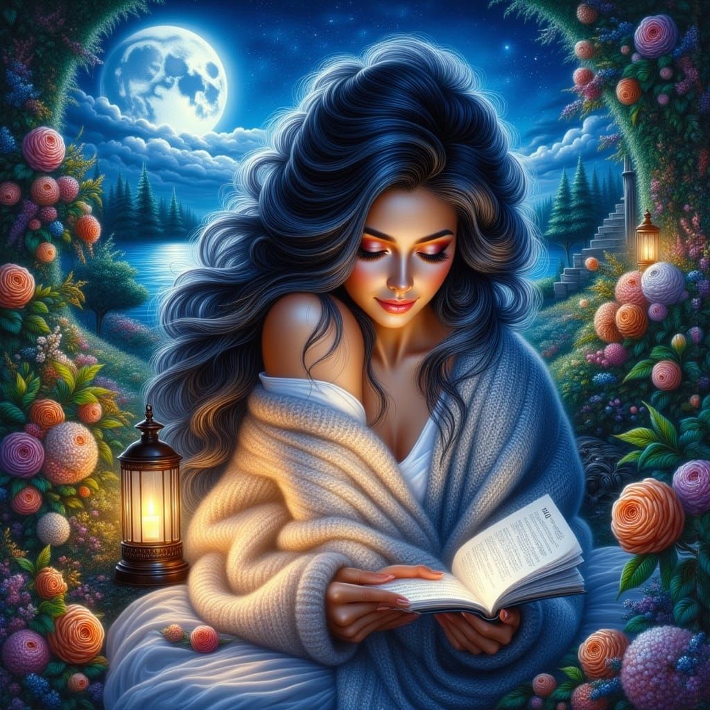A watercolor painting of a woman reading by candlelight in a moonlit garden with stars. Inspired by atmospheric and evocative coastal scene styles.