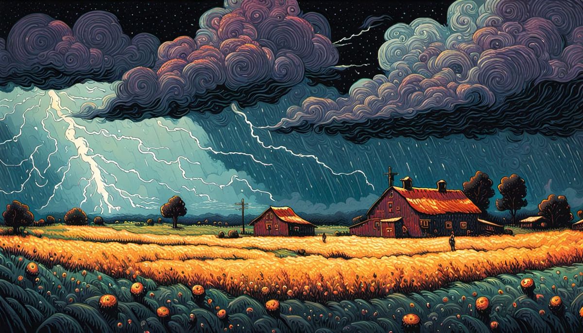 This image depicts a dramatic thunderstorm over a peaceful farmland, capturing the dynamic contrast between turbulent skies and idyllic rural scenery.