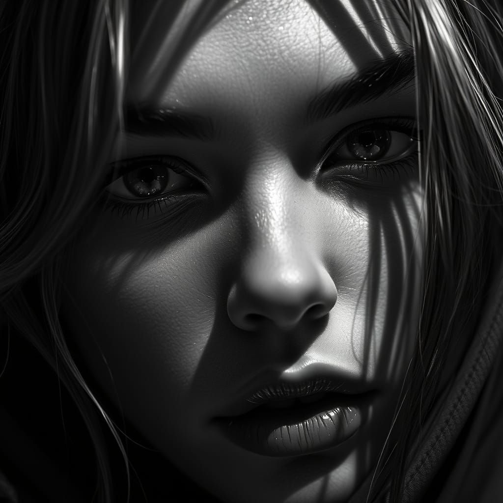 This high-fashion portrait showcases a model's face in extreme closeup, with intricate textures and details highlighted in bold, geometric shadows and crisp, defined highlights, in a highly detailed, hyper-realistic scene, reminiscent of Baroque and film noir-inspired styles