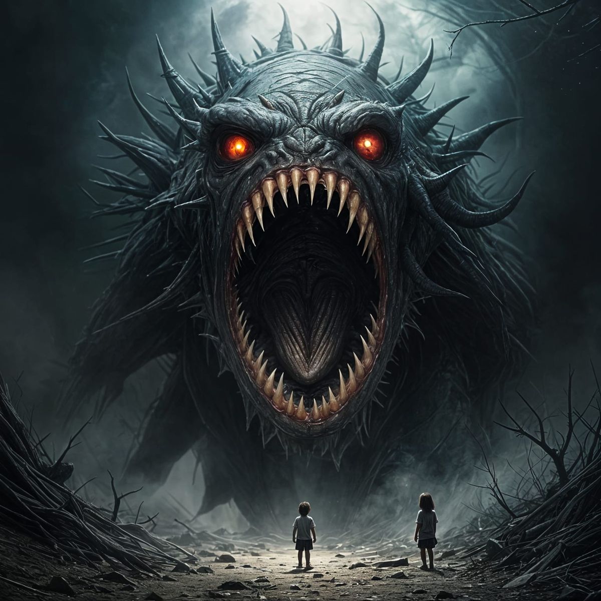 This dark fantasy art features a monstrous creature with a gaping maw and sharp teeth, emerging from shadows. Its palpable hunger and horrific atmosphere create an unsettling, Giger-Beksiński-inspired scene.