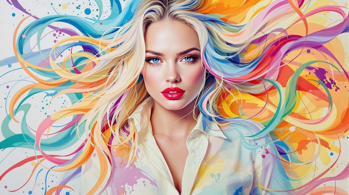 This image features a semi-realistic painting of Margot Robbie with a seductive gaze and flowing pastel hair. The vibrant colors and abstract shapes create a dynamic and detailed portrait.