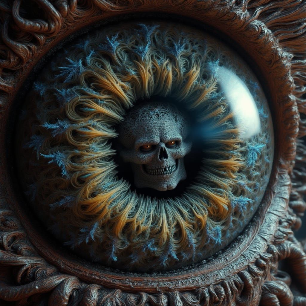 This image depicts unsettling, fractal-faced figures within a hyperrealistic human eye. The art style is surreal and illusionary, with dramatic lighting and intricate details.