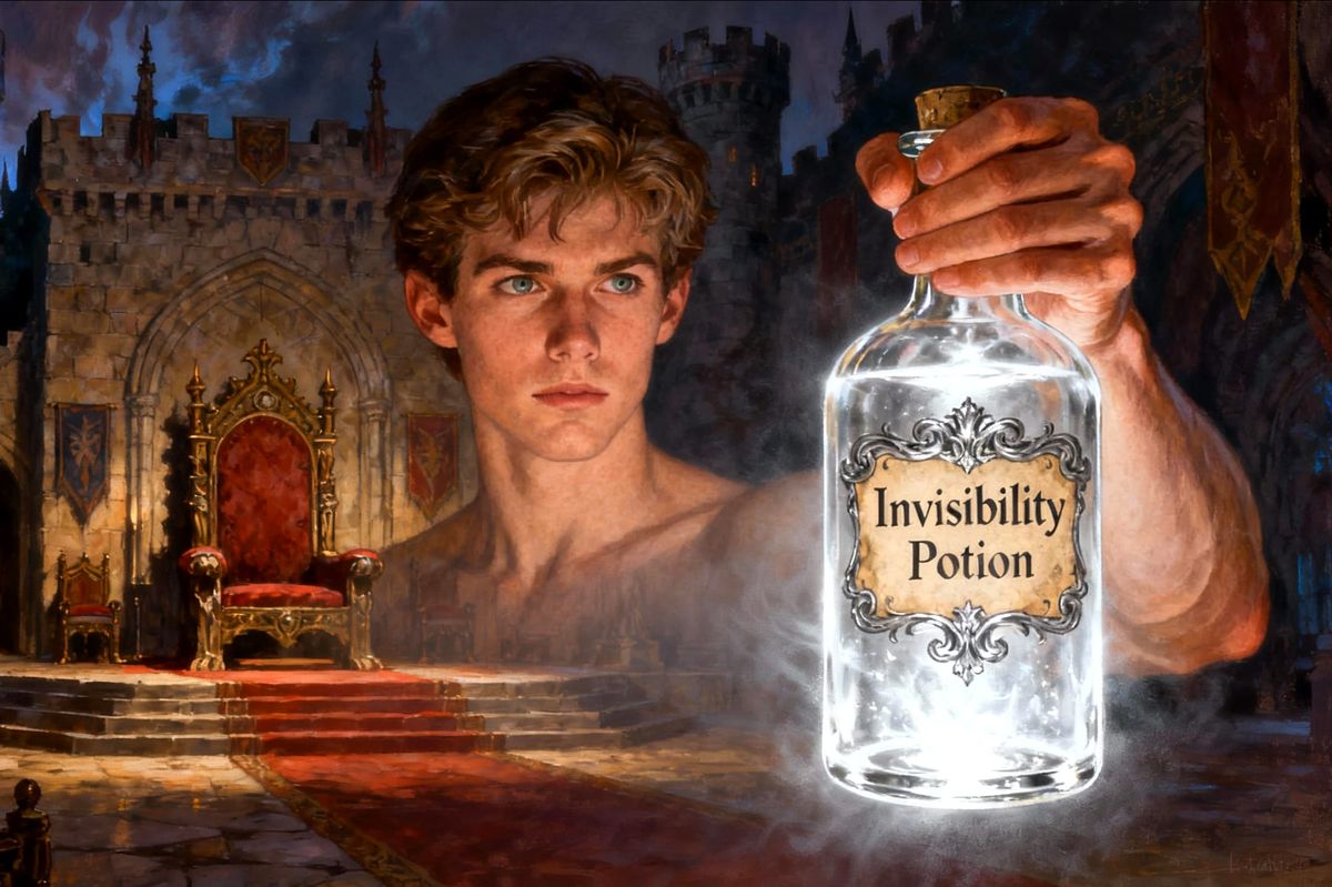 This fantasy concept art shows a man with only his head and hands visible, holding a glowing potion. Cinematic lighting highlights his vanishing form against a castle backdrop.