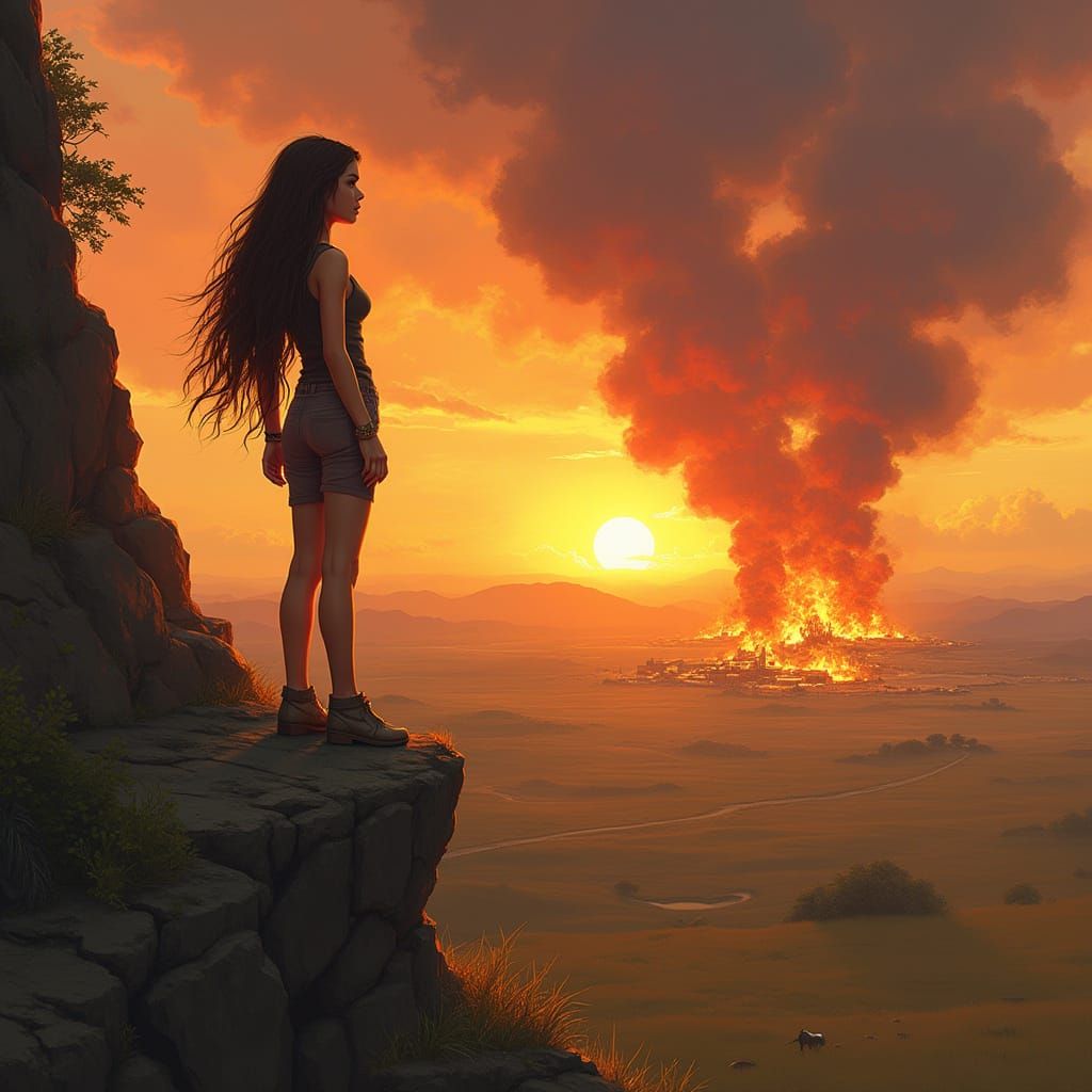 A young woman with flowing brown hair and bright green eyes stands heroically atop a rocky cliff, gazing out at the serene savanna below as the sky erupts in a kaleidoscope of warm hues, with a distant inferno contrasting starkly with the natural beauty of the surroundings, in a dynamic, cinematic style