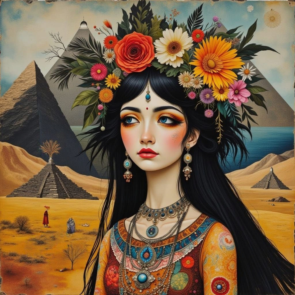 This image features a beautiful raven-haired woman with flowers in her hair, wearing an elaborate costume. It is a collaged artwork with distant mountains and pyramids.