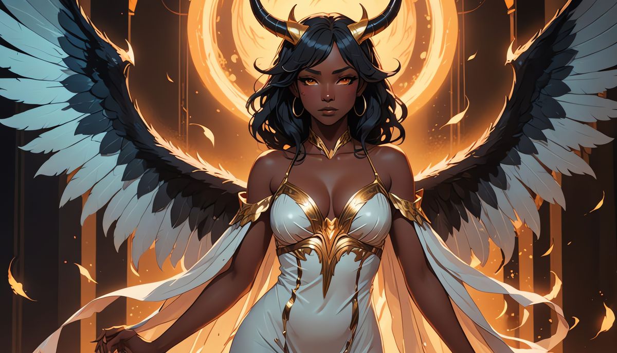 This image shows a beautiful ebony woman depicted as a demoness. She wears a negligee and has glowing horns and wings. The artwork is in a moe-inspired anime style with soft, pastel colors and warm, golden lighting.