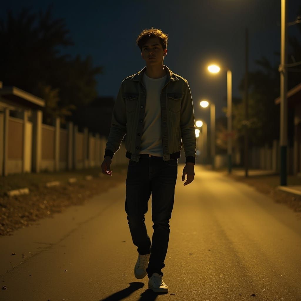 This image shows a solitary young man walking on a deserted street at night. The scene is lit by yellowish streetlights, casting long shadows and creating a melancholic mood in a cinematic style.