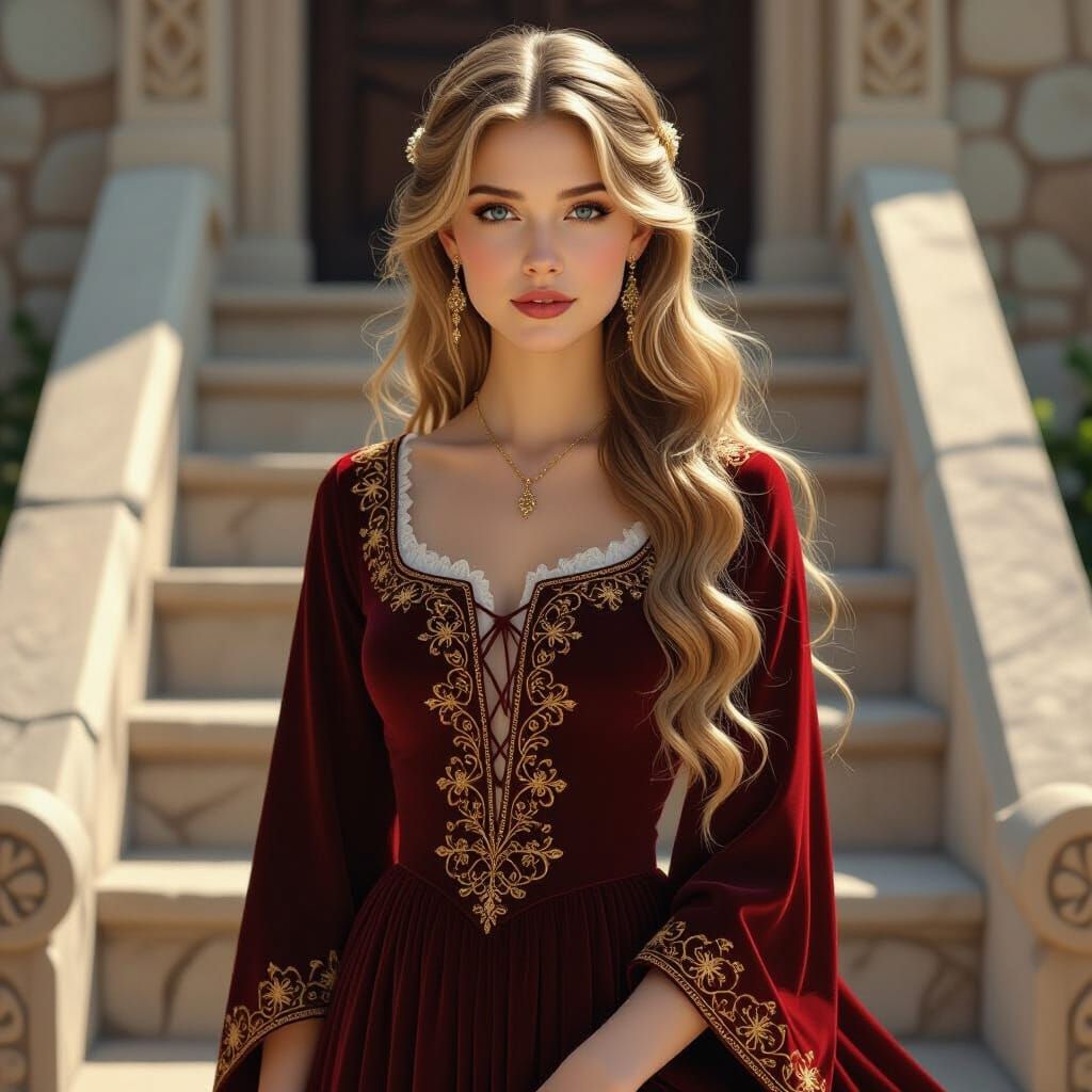 A beautiful medieval woman with long blonde hair stands on carved stone steps in this art nouveau image. The flowing red dress features golden embroidery.