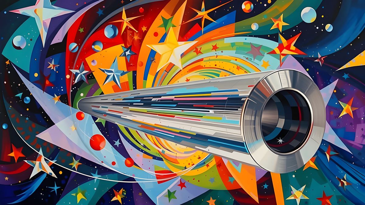 A vibrant, surreal cosmos rendered as thick impasto oil paint. This image features a spinning metallic cylinder reflecting macro closeups of colorful, abstract stars and swirls in unbounded motion.