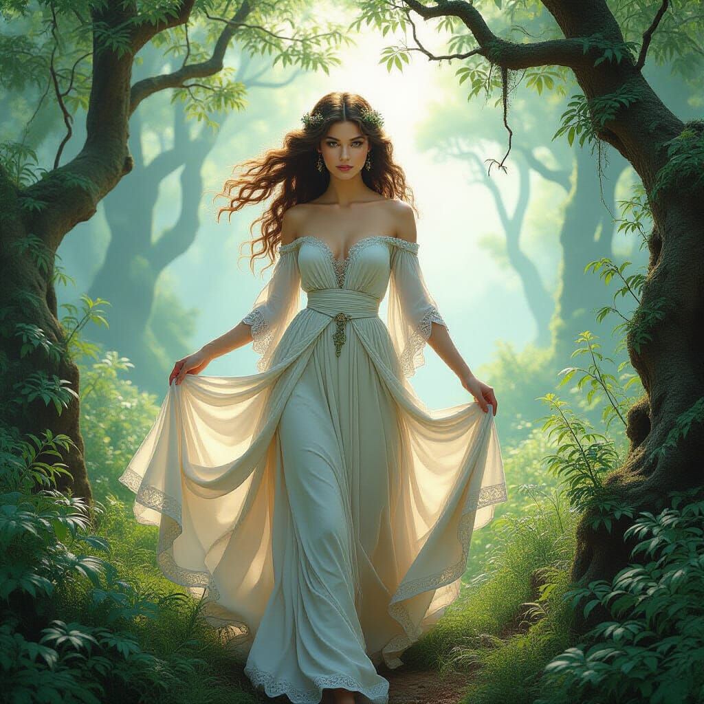This image depicts a woman in a flowing dress amidst a vibrant forest, bathed in soft, ethereal light. The artwork evokes a dreamy, whimsical ambiance with intricate details, reminiscent of classic fantasy illustrations.