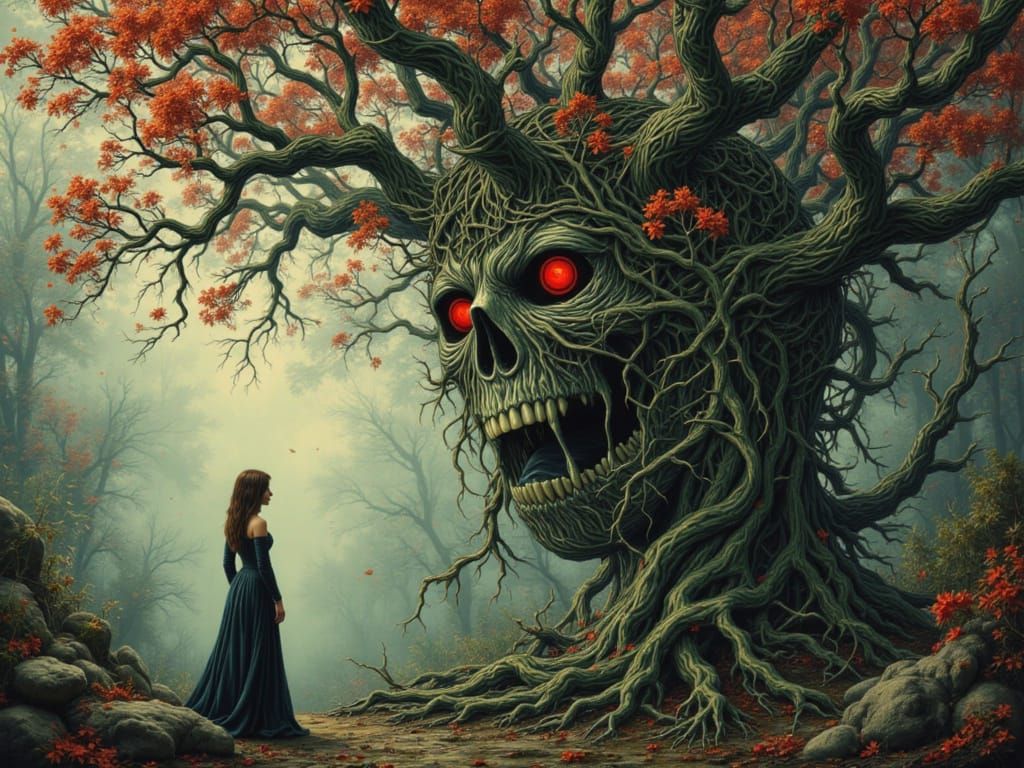 This image shows a giant, sentient tree with autumn colors, vines, and thorns. It has human-like features and expresses anguish, evoking an abstract horror and analog horror style.