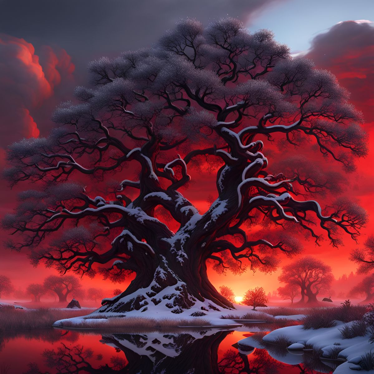 A striking picture of a solitary tree with black leaves set against a snowy landscape under a red sky. The image is a detailed digital matte painting in a fantasy concept art style.
