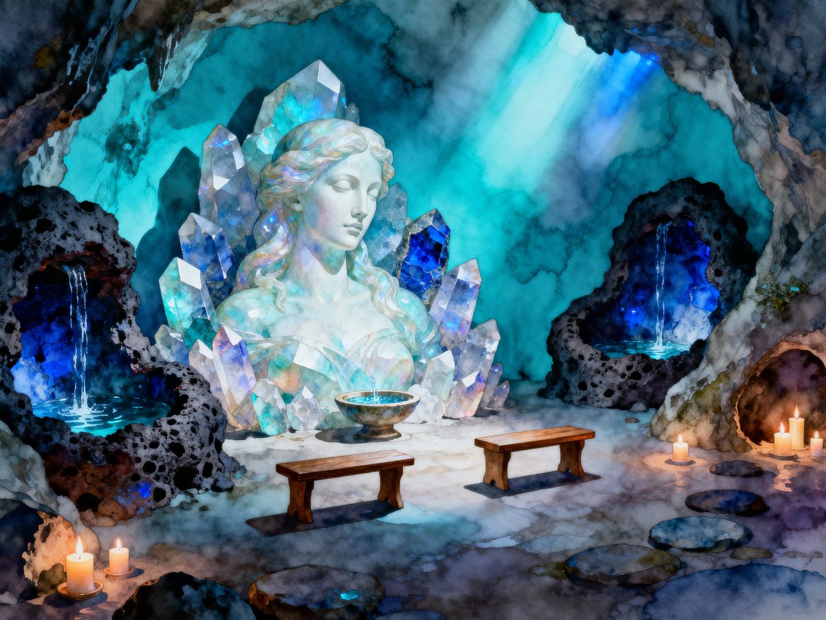 This image depicts a magical cave transformed into a chapel, featuring a sculpted face of Venus from opaline stone. Lit by candles, the scene blends fairytale wonder with futuristic photography and watercolor aesthetics.