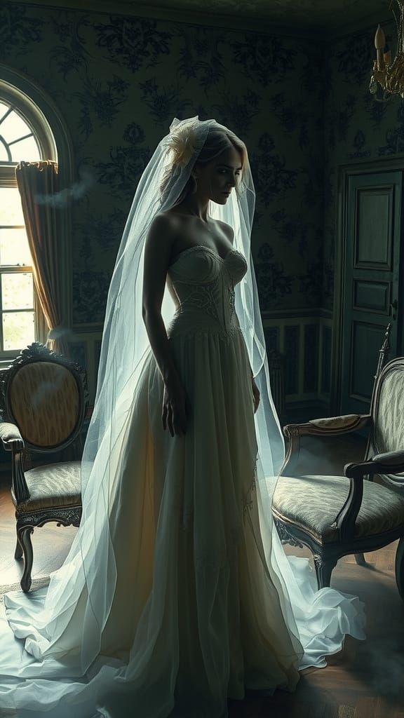 "Design a chilling double exposure featuring a female specter shrouded in a tattered wedding gown, her body glowing with a ghostly light. Layer her form with the interior of a decaying mansion, where long-forgotten memories and dark secrets lurk in every corner. ...