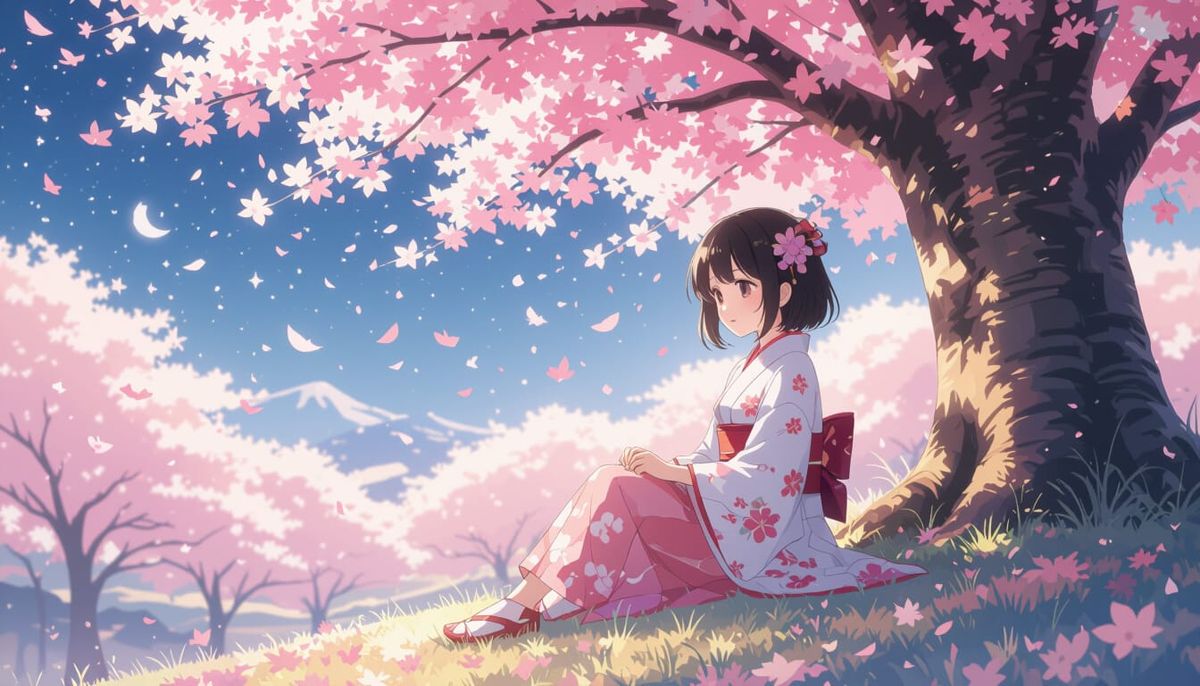 This image shows a manga-style girl peacefully sitting under a cherry blossom tree at night. The artwork features soft colors and twinkling stars in an anime aesthetic.